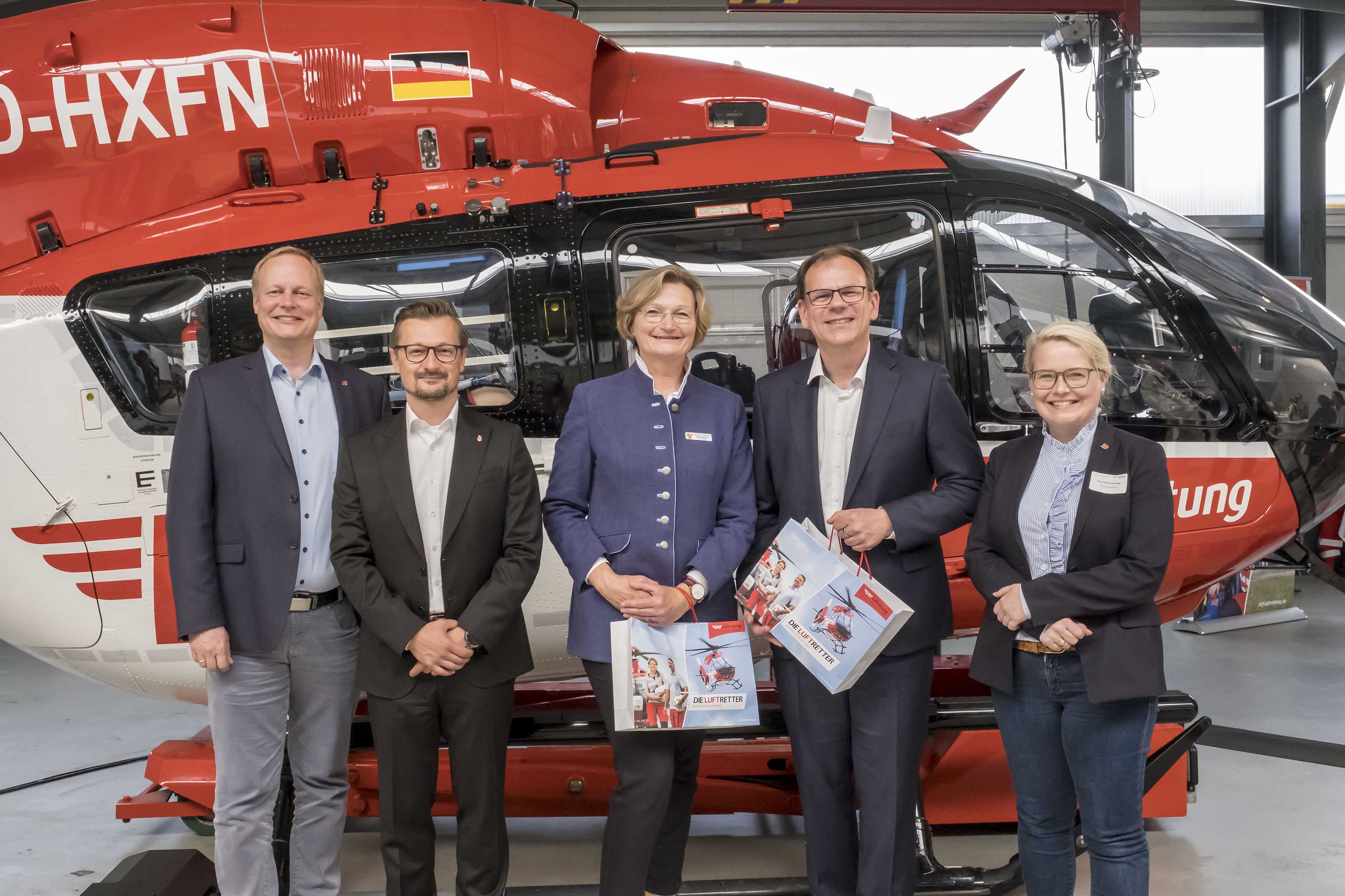 Vlnr: Thomas Jepsen, Landtagsabgeordneter Schleswig-Holstein, Roman Morka, Vorstand Technik DRF Luftrettung, Sabine Mues, Kreispräsidentin Kreistag Rendsburg-Eckernförde, Dr. Olaf Tauras, Gesundheitsstaatssekretär Schleswig-Holstein, Rixa Kleinschmit, Landtagsabgeordnete Schleswig-Holstein (Foto: Peter Lühr, Quelle: DRF Luftrettung)
