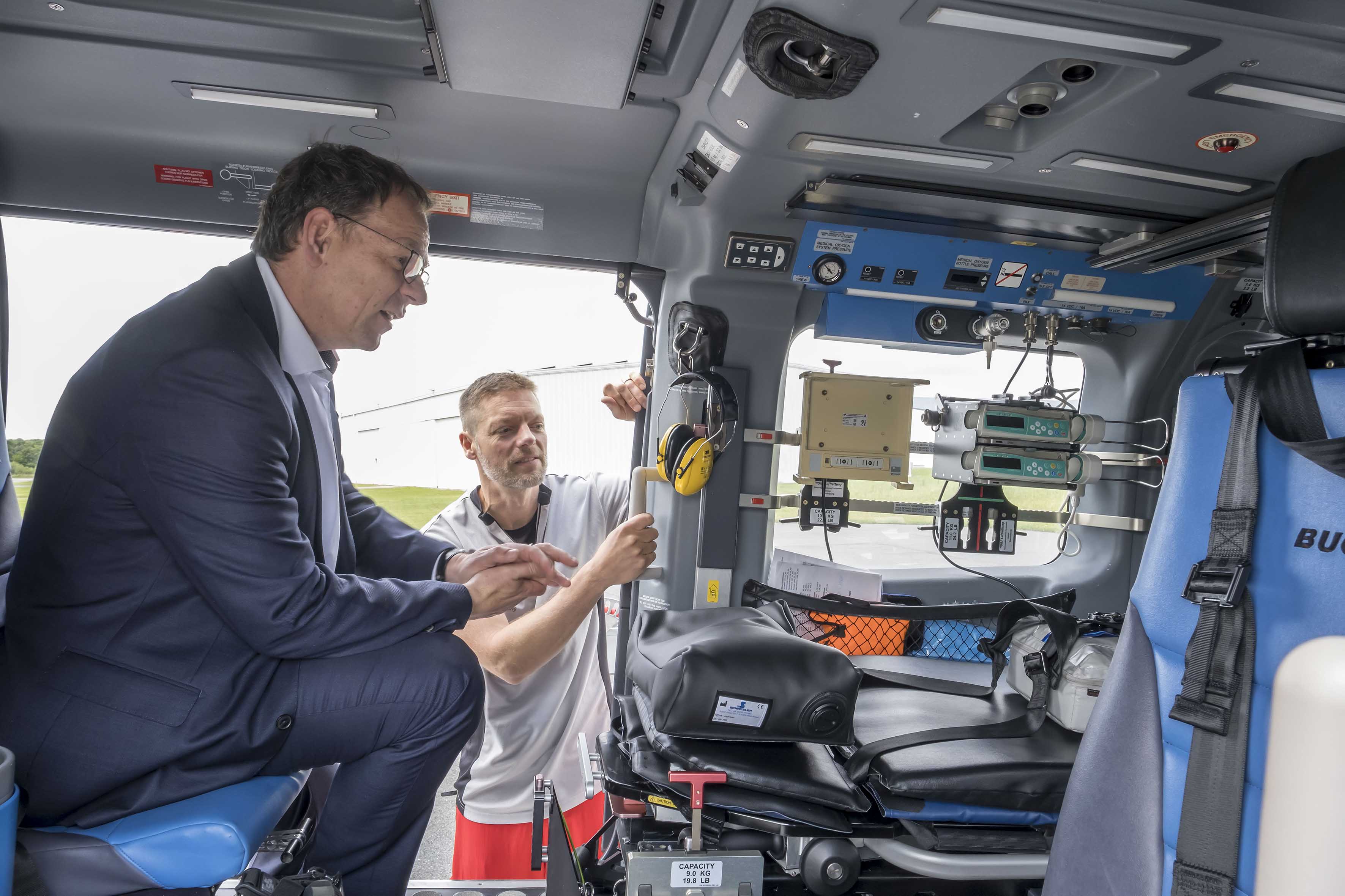 Im Anschluss an die Grußworte nutzte Staatssekretär Tauras die Gelegenheit, die Station zu besichtigen. Auch ein intensiver Blick in den hochmodernen Hubschrauber des Typs H145 mit Fünfblattrotor war Teil des Rundgangs. Die Crew beantwortete dabei Fragen rund um die fliegerische und medizinische Ausstattung von Christoph 42, der sowohl für Einsätze in der Notfallrettung als auch für dringende Transporte zwischen Kliniken optimal geeignet ist.