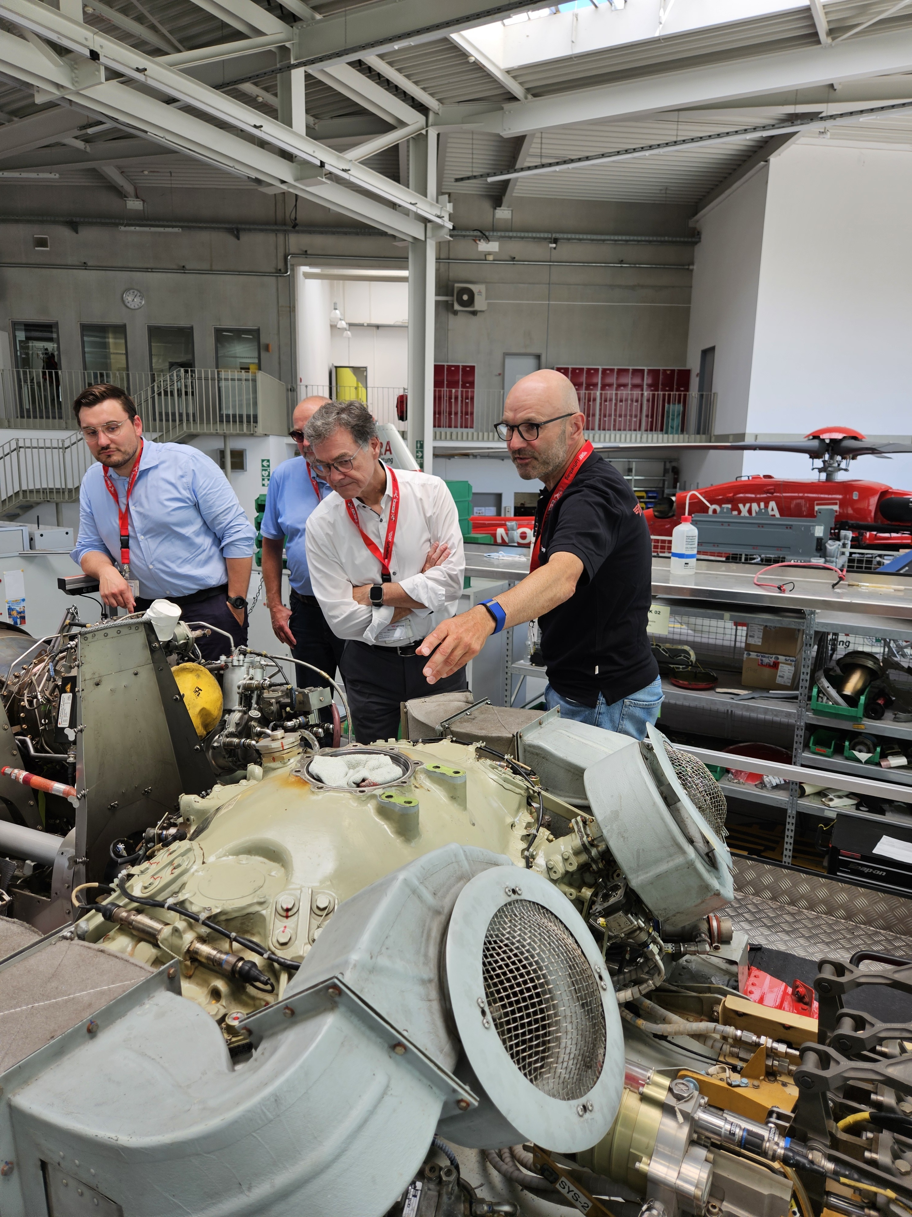 Ralph Tiesler (2. v. r.), Präsident des Bundesamtes für Bevölkerungsschutz und Katastrophenhilfe (BBK) im Austausch mit Marcus Sandrock, Dr. Krystian Pracz, Vorstandsvorsitzender, und Michael Junghans, alle DRF Luftrettung. (v.l.n.r.)