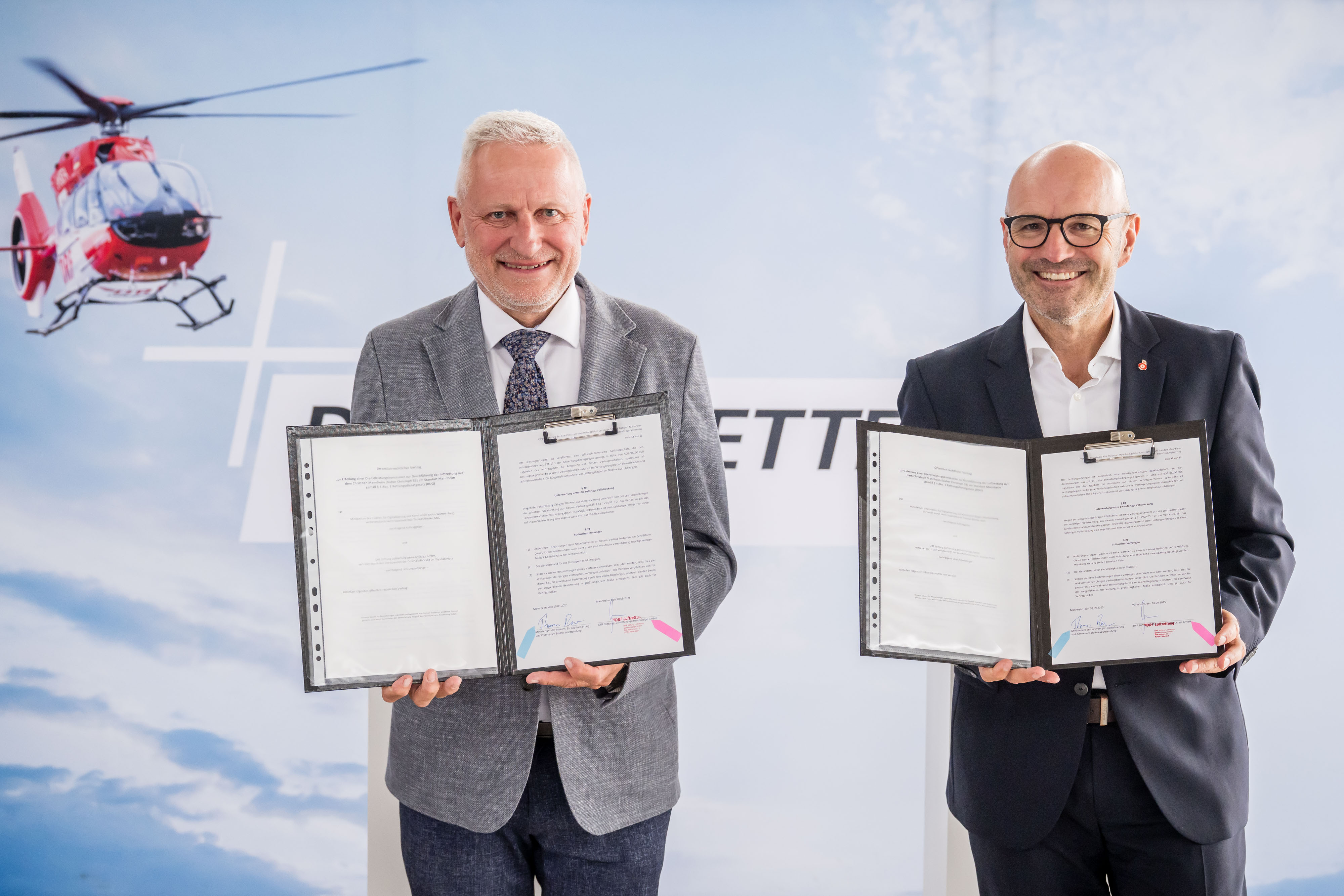Vertragsunterzeichnung in Mannheim: Die DRF Luftrettung übernimmt den Betrieb der Luftrettungsstation für weitere 15 Jahre. (Quelle: Maximilian von Lachner/DRF Luftrettung)