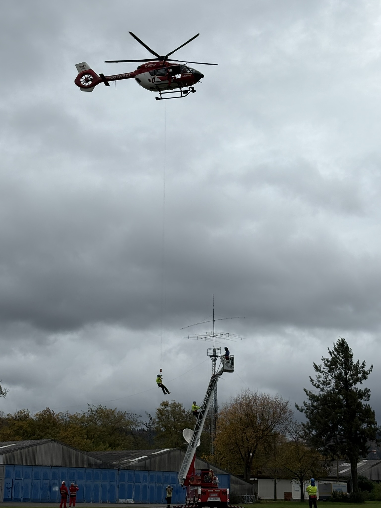 Ein weiterer Schwerpunkt lag auf der Kapprettung: Dabei wird die Rettung eines im Seil hängenden Kletterers geübt, der durch Luftretter und Rettungswinde aus seiner misslichen Lage befreit wird. Wegen der herausfordernden Wetterlage errichtete die Feuerwehr Freiburg an der Station der DRF Luftrettung einen Übungsbereich mit einer Drehleiter, an der das Szenario realitätsnah dargestellt werden konnte.