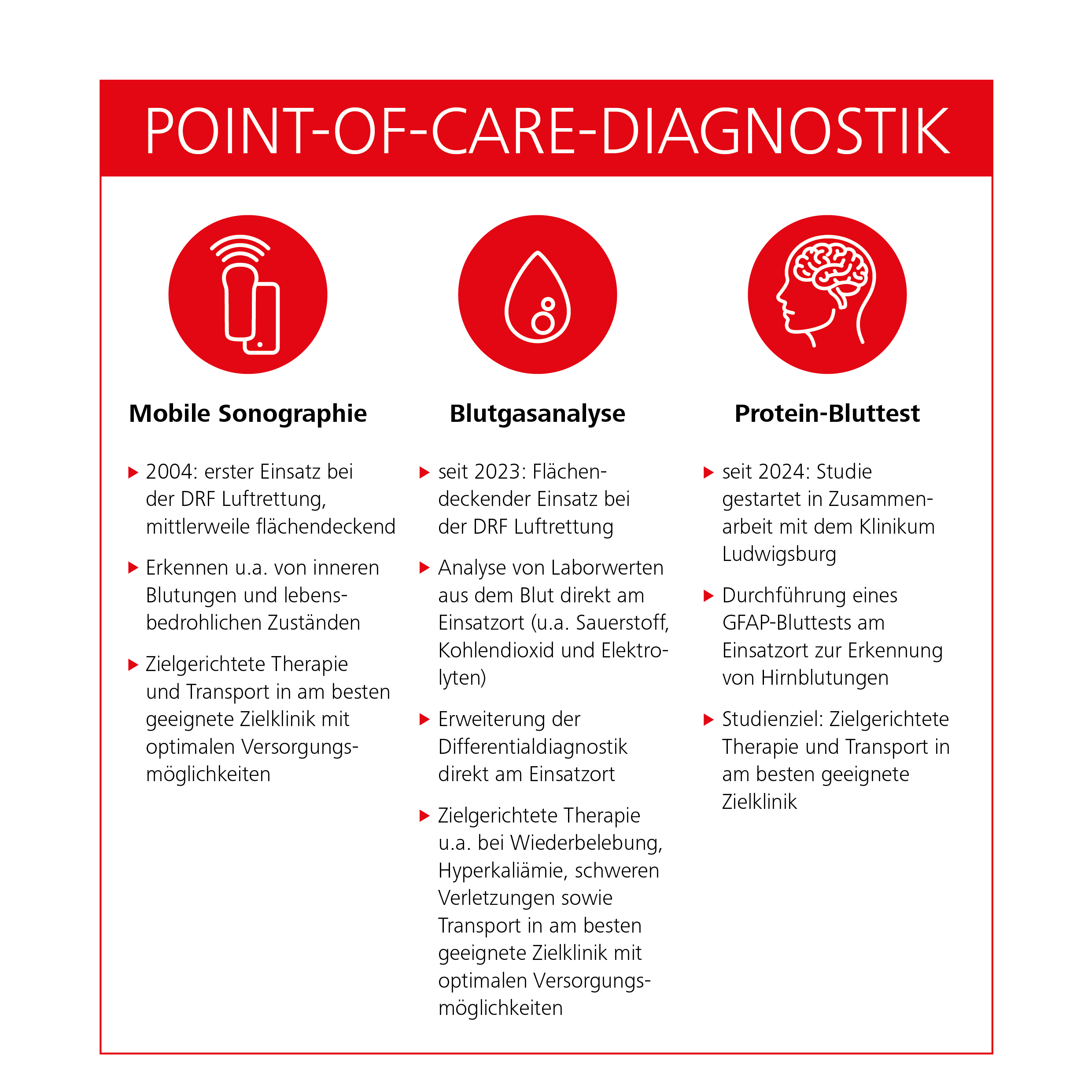 Im Notfall kommt es darauf an, schnell Klarheit über den Patientenzustand zu gewinnen, um eine zielgerichtete Therapie einzuleiten. Die Notärzte und Notfallsanitäter der DRF Luftrettung sind dazu bestausgebildet und verfügen über eine hochmoderne Ausrüstung zur erweiterten Diagnostik bereits am Einsatzort. Durch den Einsatz kleiner, leichter und damit mobiler Ultraschallgeräte können innere Blutungen, Verletzungen und Erkrankungen besser und schneller erkannt und therapiert werden. Unterstützt durch Spendengelder, setzt die DRF Luftrettung seit 2023 flächendeckend mobile Blutgasanalysegeräte ein. Sie ermöglichen direkt am Einsatzort Analysen des Blutes, die bisher nur durch aufwändige Laboruntersuchungen in der Klinik durchführbar waren. Auch diese Diagnostik trägt dazu bei, Krankheitsbilder schneller und sicherer zu erkennen und therapieren. Die Entwicklung ist damit jedoch noch nicht am Ende: In der notfallmedizinischen Forschung beteiligt sich die DRF Luftrettung mit ausgewählten Stationen an der Erprobung eines Protein-Bluttests, mit dem sich Hirnblutungen bereits am Einsatzort diagnostizieren lassen.