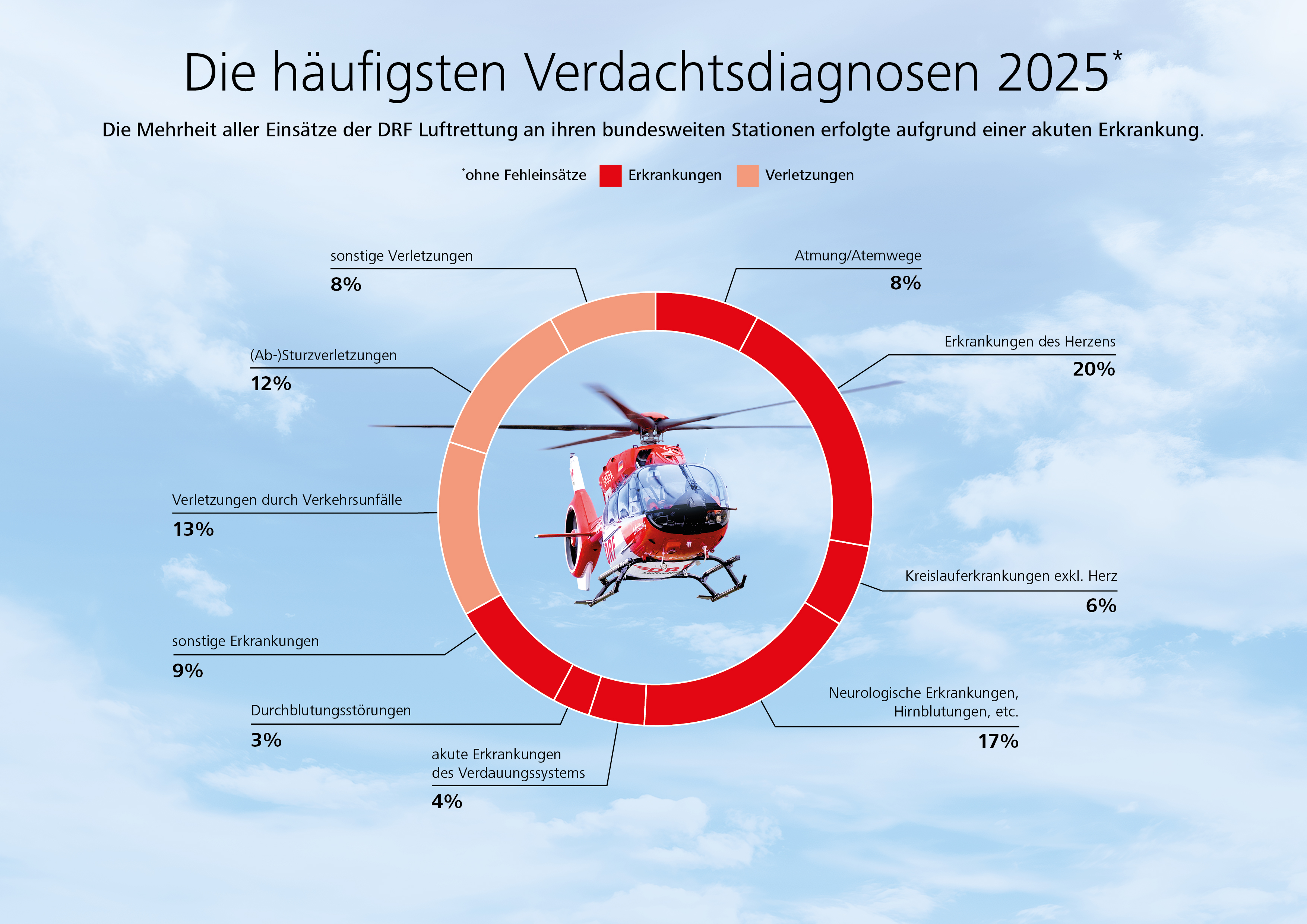 Häufigste Alarmierungsgründe zu Notfalleinsätzen der Hubschrauber waren wie in den Vorjahren Herz-Kreislauf-Erkrankungen wie Herzinfarkt oder Schlaganfall: medizinische Notfälle, bei denen die schnelle Hilfe aus der Luft überlebenswichtig ist. Auch zu Unfällen und Stürzen wurden die rot-weißen Luftretter besonders oft alarmiert. 226-Mal kam die Rettungswinde zum Einsatz, um Patienten auch in schwer zugänglichem Gelände schnell notärztlich zu versorgen und auszufliegen: im Vergleich zum Vorjahr ein Plus von 41 Prozent.